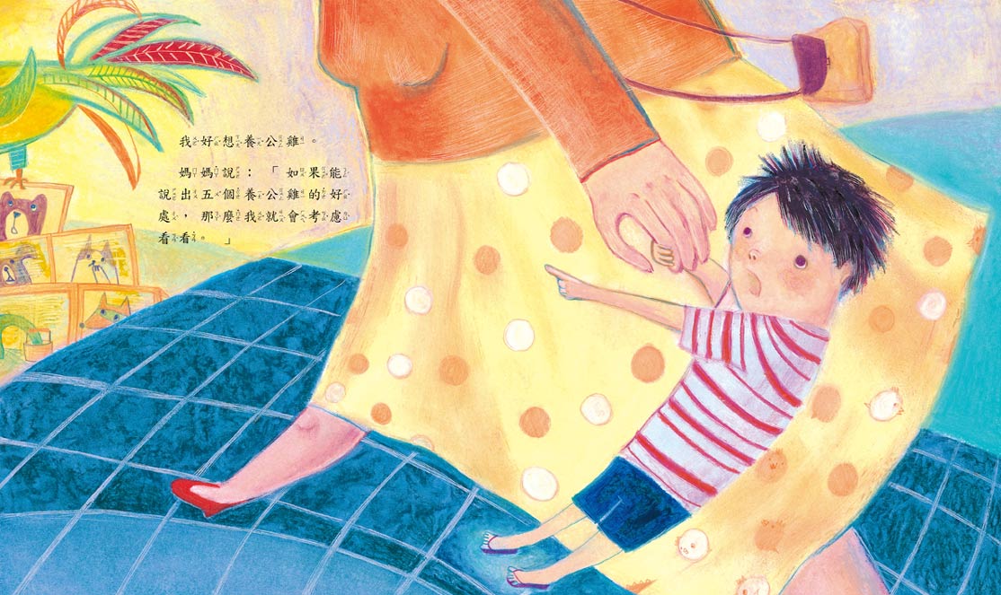 電視裡的公雞超人好酷,又會抓壞人,又能陪我玩,我好想養公雞,可是媽媽要我說出五個理由之後卻又不肯答應。哼!爸爸媽媽都這樣,每次都說話不算話,不過沒關係,我一定要想辦法說服他們。