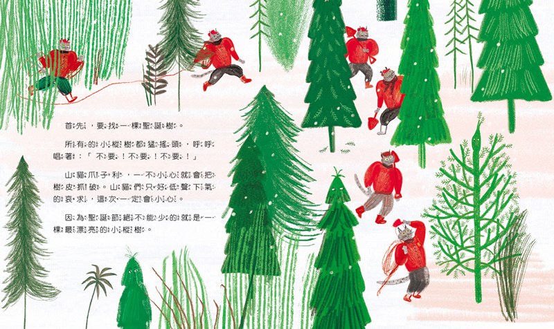 首先,他們需要一棵最漂亮的聖誕樹,聽到「最漂亮的」四個字,馬上有一棵小樅樹自告奮勇;再來要撈起許多掉在池塘裡的小星星,一顆顆烘乾後掛在聖誕樹上;當然還要烤一個全世界最大的蛋糕!山貓們趕快四處尋找好材料;山貓劇團也加緊排練,山貓合唱團出動報佳音,順便邀請所有動物們來看今晚的表演。