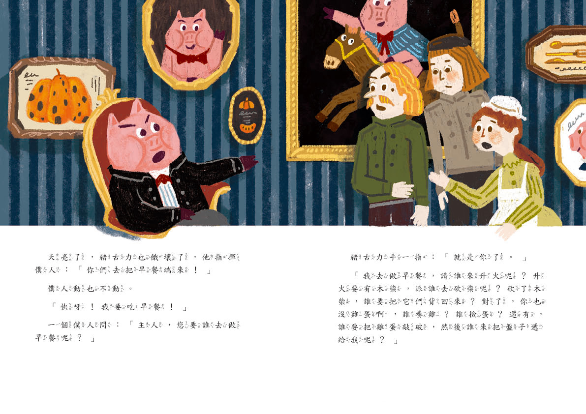 「天啊!是世界上最好吃、最美味的南瓜!」豬古力奮力衝到南瓜旁,用短短的小手捧起南瓜,張大嘴準備飽餐一頓,忽然,有個聲音說:「等等!不要吃我!」豬古力餓壞了,他才不想等呢!沒想到那個聲音又說:「我可以實現你的願望,我給你一個願望,不!我給你三個!」
