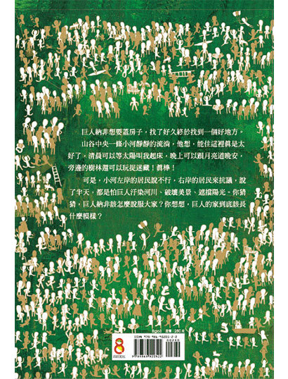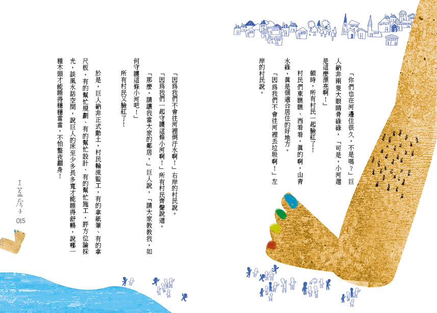 可是,小河左邊的居民說不行,右邊的居民來抗議,說了半天,都是怕巨人汙染河川、破壞美景、遮擋陽光。你猜猜,巨人納非該怎麼說服大家?你想想,巨人的家到底該長什麼模樣?