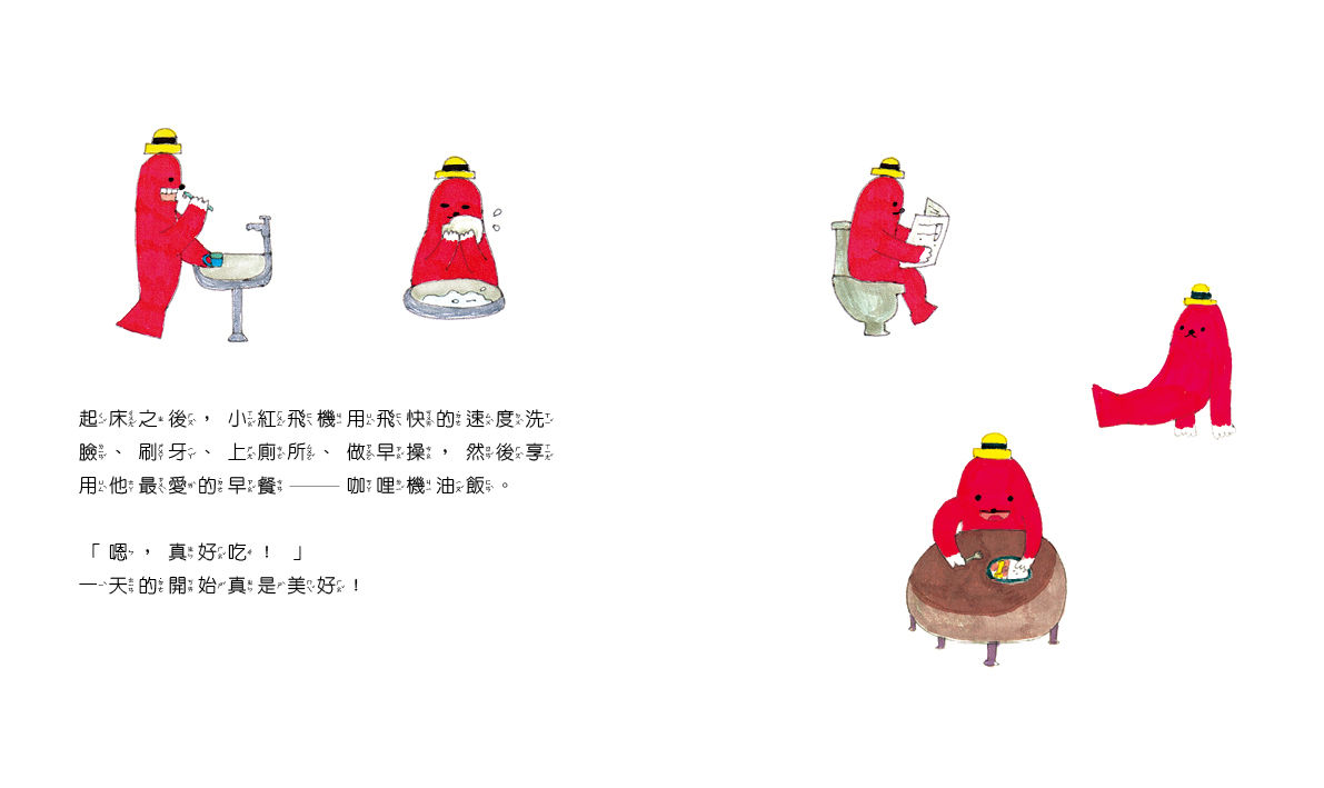 小紅飛機每天早上六點,咕咕鳥一叫就起床了,為什麼要那麼早起呢?因為他要刷牙、洗臉、做早操,還要吃最愛的早餐:咖哩機油飯,吃飽之後,跟路上每一個人說早安,慢慢的飛到公司。