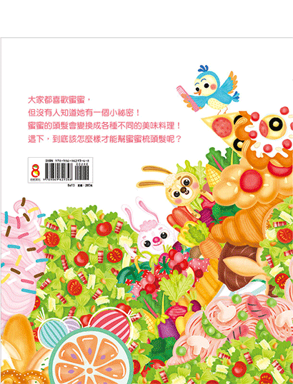 原來啊原來,蜜蜜的頭髮有神奇的魔法,會變來變去變成好吃的食物,所以啊所以,親愛的媽媽,不是我不想梳頭髮,而是因為它現在不是頭髮嘛!