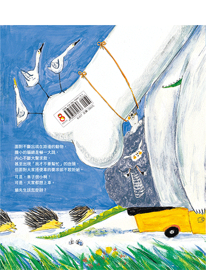 膽小的貓一路上面對不斷出現在路邊的黑影,總是先嚇一大跳,雖然假裝面無表情,內心卻不斷大聲求救,偶爾還會冒出「我才不要幫忙呢」的念頭,但面對大家希望搭便車的要求卻不敢拒絕。眼看出現的動物愈來愈多,這台小到不行的車真的能繼續前進嗎?會有人發現這台車的祕密嗎?貓又會在這趟旅程中改變什麼嗎?